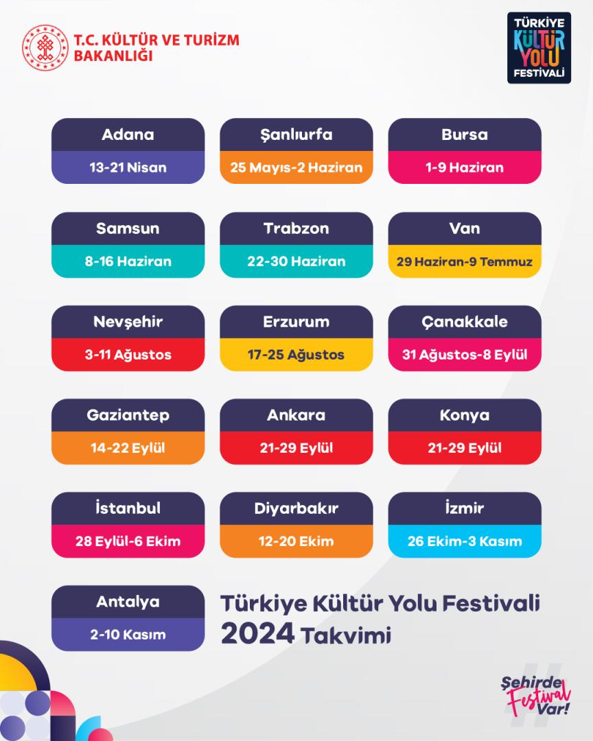 Türkiye Kültür Yolu Festivali, 13 Nisan’dan 10 Kasım’a kadar 16 farklı şehirde, 8 aya yayılmış bir kültür-sanat maratonuyla ülkeye adeta bir festival iklimi yaşatacak.